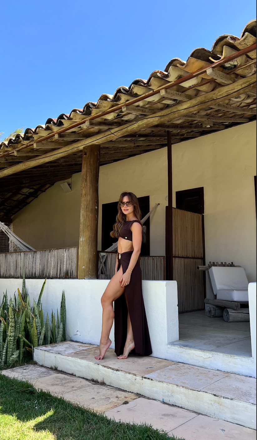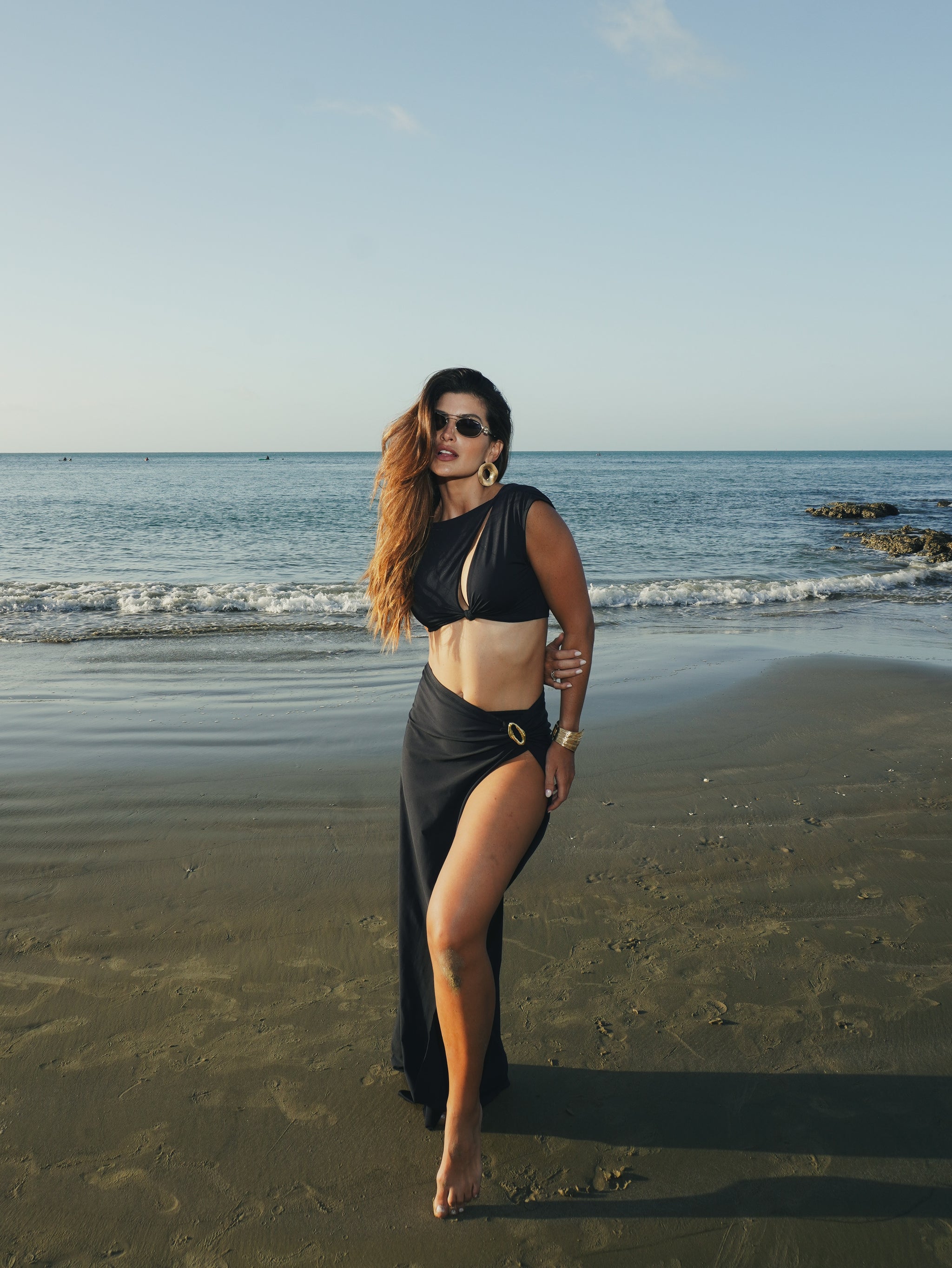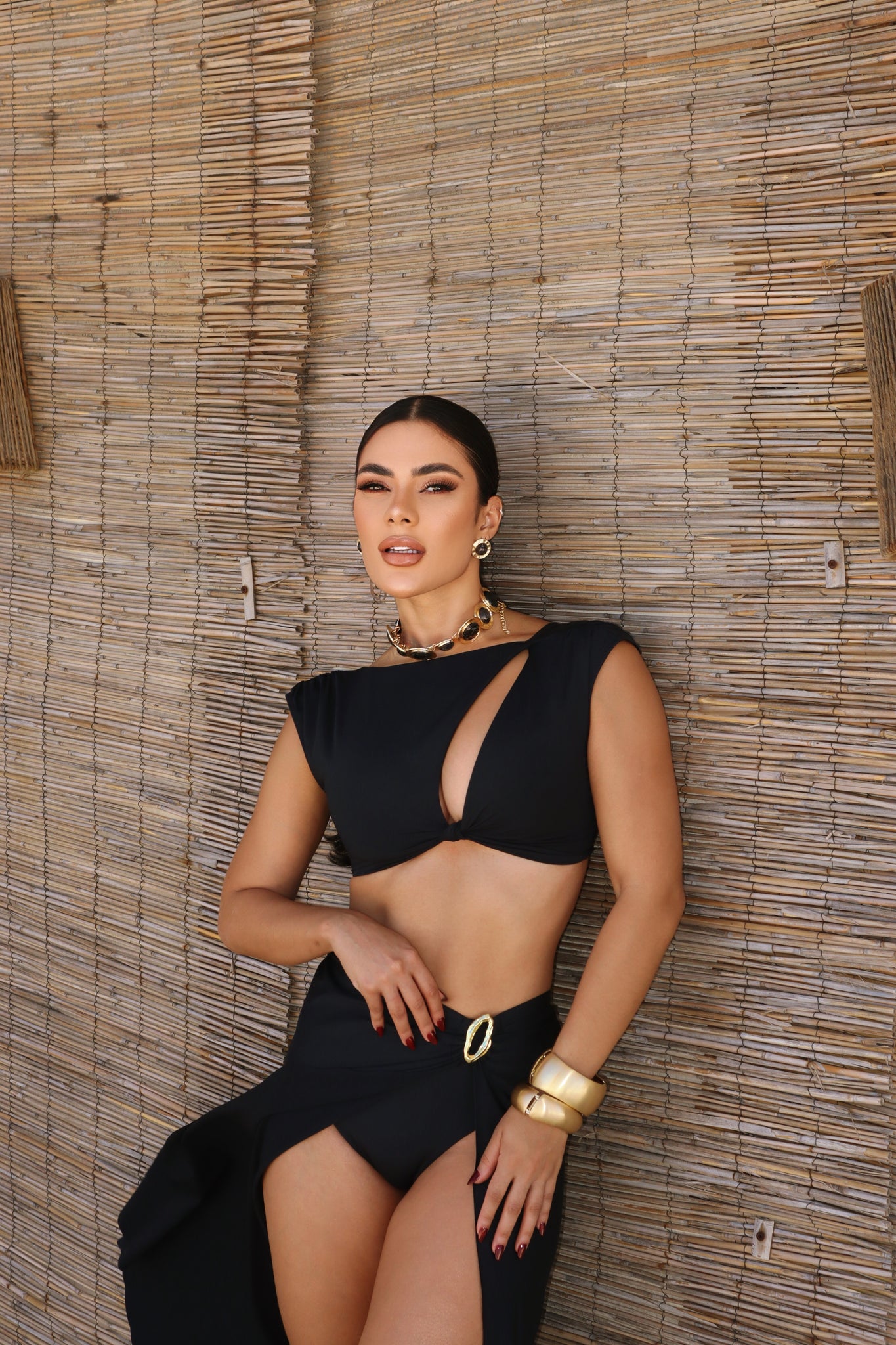 O destaque fica por conta da fenda lateral profunda, que valoriza as pernas e garante sensualidade na medida certa, enquanto o detalhe em argola no cós adiciona um charme moderno e diferenciado.