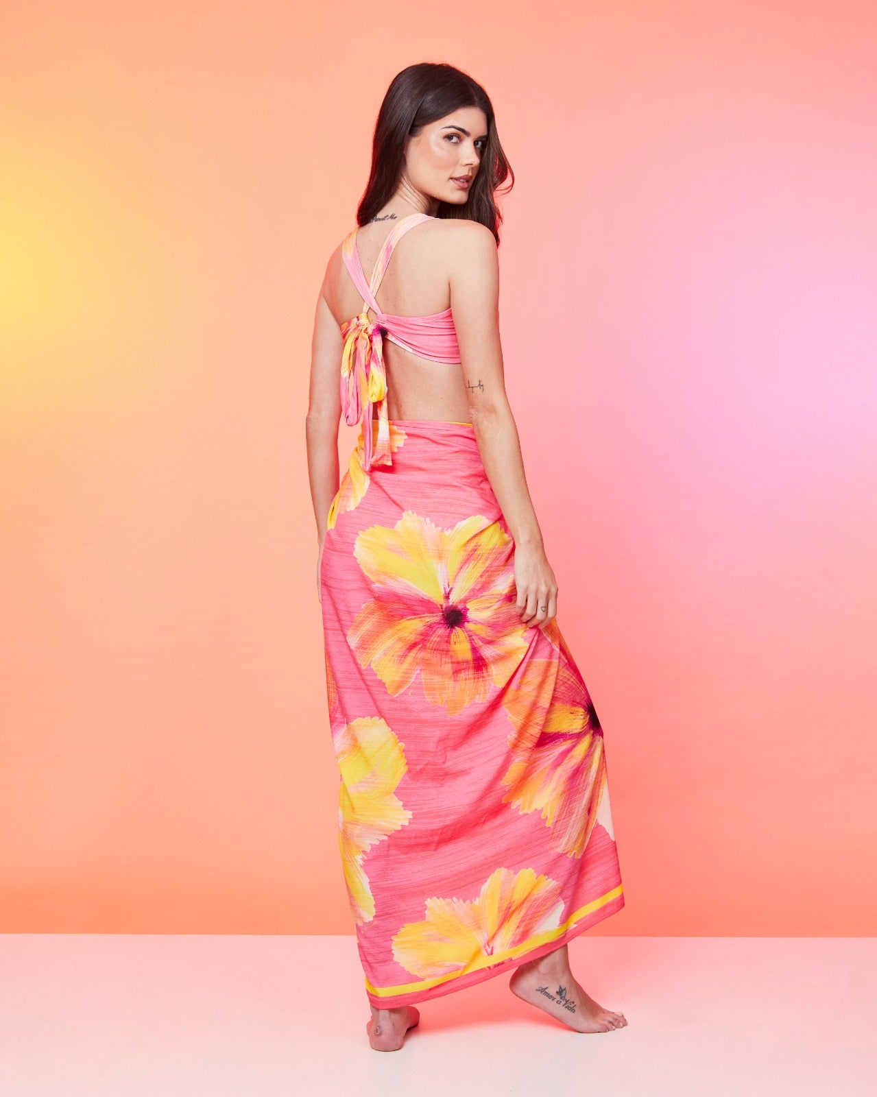 A energia do verão traduzida em uma peça única! A canga pareô floral é a escolha ideal para quem deseja unir estilo, praticidade e frescor nos dias de sol. Com estampa de flores em tons vibrantes de rosa e amarelo, ela traz alegria e feminilidade para qualquer look de praia ou piscina.