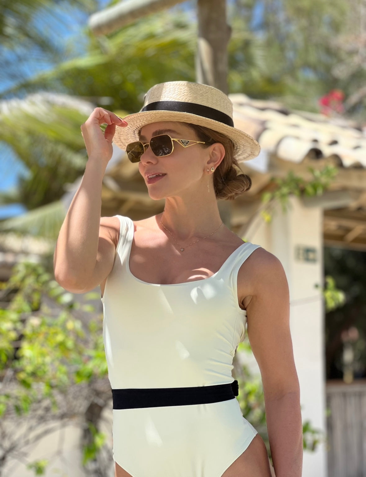 Elegância e sofisticação em uma peça única. O Maiô Cinturado Off-White traz modelagem clássica e atemporal, com decote reto e costas cavadas que valorizam a silhueta de forma sutil e feminina. O destaque fica por conta do cinto em laço preto removível na cintura, que cria um contraste elegante e define as curvas com delicadeza.